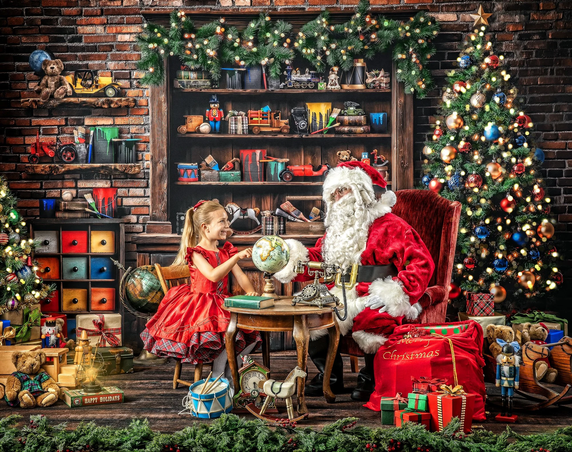 Welcome to Merry Maker Workshop, where bookshelves overflow with Christmas toys, and teddy bears. In the heart of this festive room, your child will sit beside Santa, where they will trace the route of Santa’s sleigh on a small antique globe. Santa will help them find the location of their home and explain how he’ll land on the rooftop with Rudolph leading the team. All children are wide-eyed and curious, eager to hear about reindeer flight paths and Christmas Eve secrets. Giggles can be heard, as Santa calls the North Pole on his antique telephone, hoping for an update from his elves.